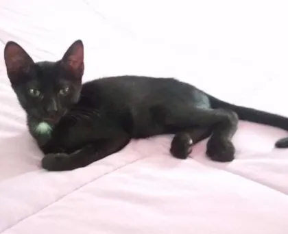 Gatinho preto, pelo brilhante e com uma medalhinha branca no peito.\