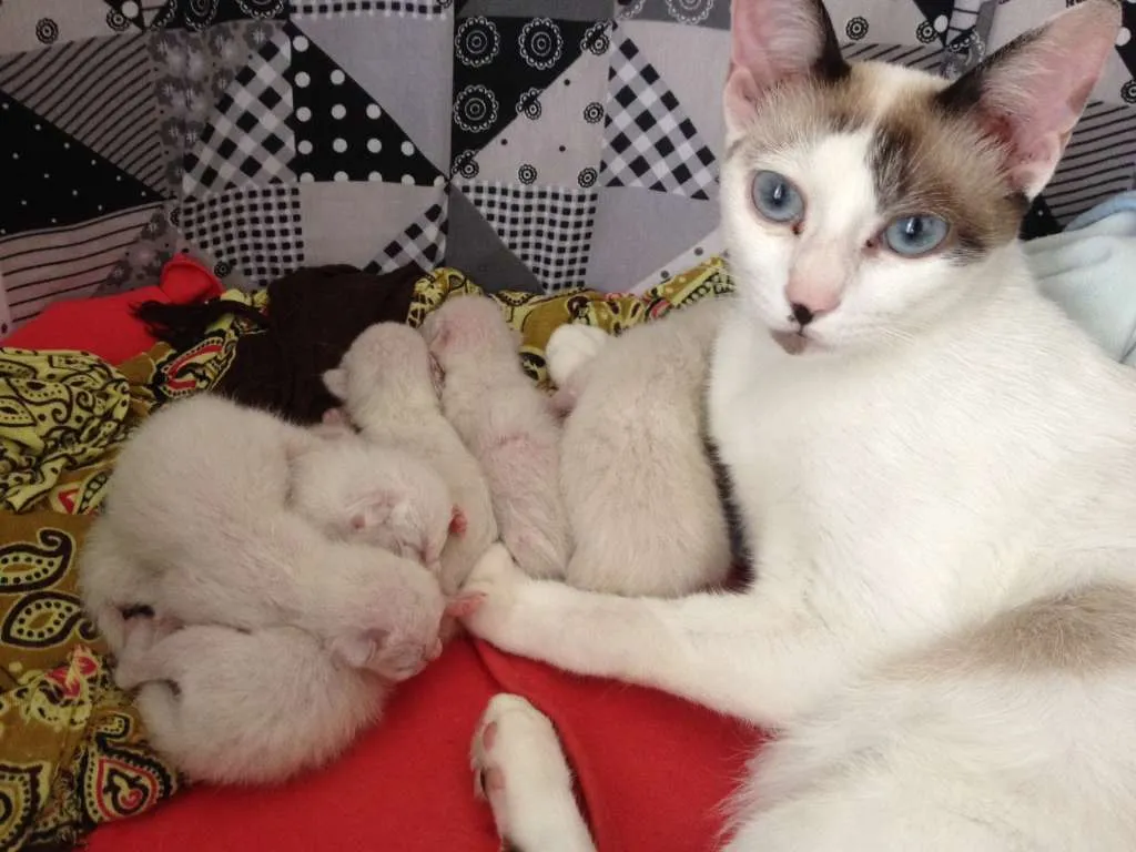 Gatinha de pelo branco, rabo e orelhinhas marrons e olho azul. É muito dócil, gosta de carinho e de ficar perto das pessoas. Acostumada com ração e caixa de areia. Foi encontrada em dezembro de 2017 pelo bairro, rodou de casa em casa e se instalou na nossa garagem. Depois de alguns dias percebemos que ela estava prenhe e resolvemos cuidar dela para que tivesse os filhotes de forma segura. Mas como não sabemos se ela está perdida ou se foi abandonada, seguimos buscando por seus donos.