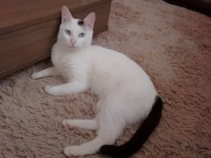 Gata desaparecida em Vila Antonieta, SP. Pelos brancos, rabo marrom escuro, manchas marrom na orelha e patas, olhos azuis. Castrada e com chip.