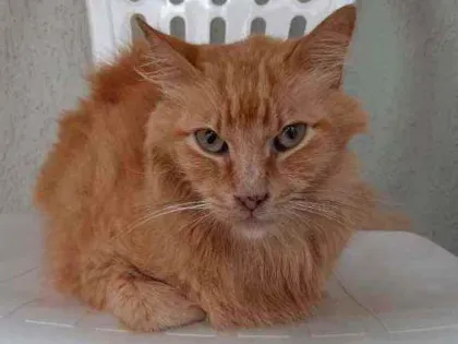 Estava com coleira verde. Tem manchinhas pretas no nariz e boca. Está doente, vomitando sempre que come e bebe água. Precisa de remédios e comida específica.