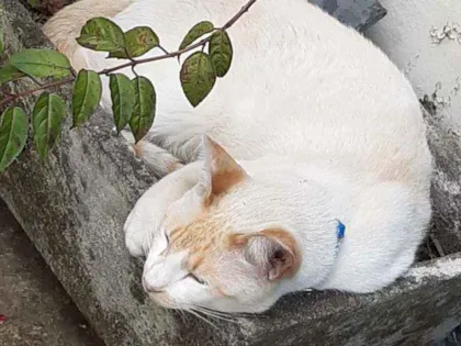 Gato bonito mas arisco, branco com detalhes na testa e rabo bege, mia bastante, coleira azul com identificação, Planalto Paulista - SP nas imediações da Av. Ceci