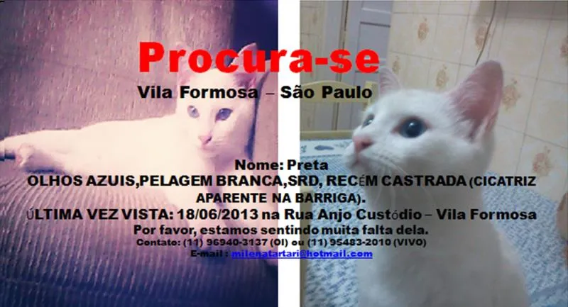 Ajude a encontrar Preta, gata SRD de pelagem branca e olhos azuis, desaparecida desde 18/06/2013. Compartilhe e ajude-nos nessa busca emocionante.