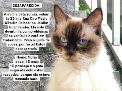 Ajude a encontrar Sofia, uma gata Sagrado da Birmânia de 15 anos que desapareceu em Interlagos. Compartilhe e ajude a trazê-la de volta!