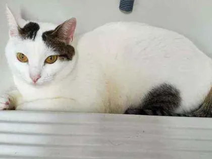 Conheça a Tapioca, uma gata branca de 2 anos, com rabo listrado e manchas nas orelhas. Adote essa fofa que procura um lar em São Paulo!