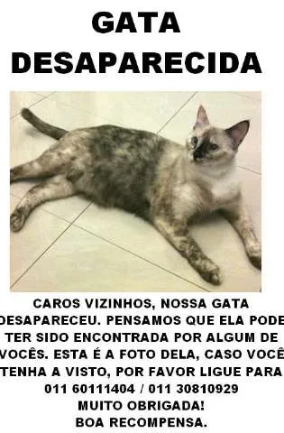 Gata de 4,5 anos sumiu no Bairro Cerq. Cezar/ Alameda Itu mistura Siames e vira lata cinza e branca de olhos azuis, mancha preta comprida no nariz
