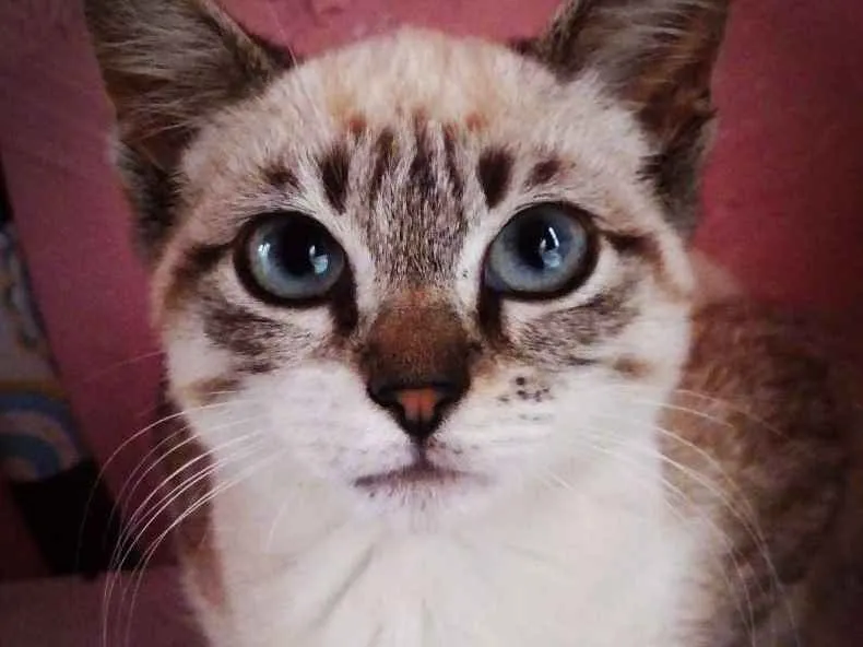 Luna aparenta ter uns 4 meses e meio tem olhos azuis orelhas marrom pelagem branca com rajados marron muitoo linda...