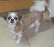Ele é marron bem claro quase caramelo com branco, e tem manchas pretas na barriga. Está totalmente tosado menos o rabo.