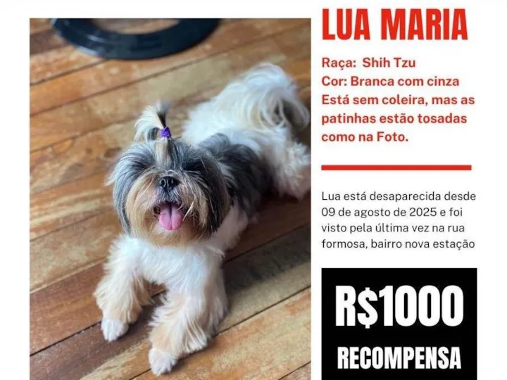 Procura-se por Lua, uma cachorrinha da raça Shih Tzu que desapareceu em 09 de agosto de 2025. Lua tem 3 anos, é de porte pequeno e tem uma pelagem predominantemente branca com detalhes em cinza. Uma característica marcante é que suas patas estão tosadas no estilo "botinha". Lua é extremamente dócil, brincalhona e se adapta bem a ambientes de apartamento. Ela também é muito sociável, convivendo bem com crianças e até com desconhecidos. Além disso, Lua precisa de cuidados especiais, então estamos ansiosos para tê-la de volta em segurança. Se você tiver qualquer informação sobre o paradeiro dela, por favor entre em contato. Oferecemos uma recompensa para quem nos ajudar a encontrá-la. Sua colaboração é muito importante para nós! Agradecemos desde já por qualquer ajuda que possa oferecer.