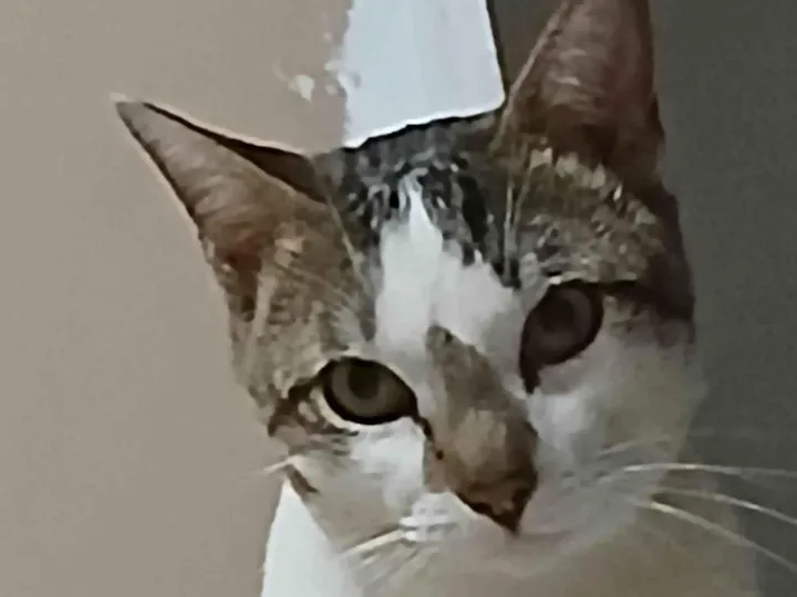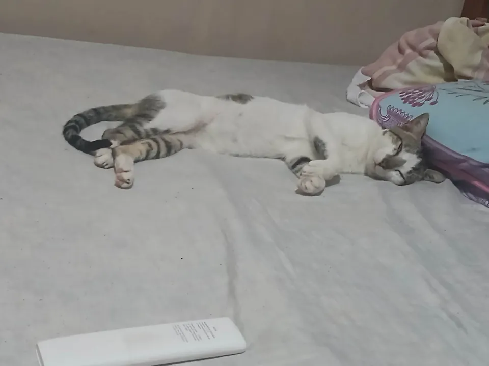 Gato macho branco com machas tigradas no rabo, patas traseiras, rosto, orelhas, uma mancha única redonda na barriga/costas e nas dobras das patas da frente, as bordas das orelhas faltam pequenissimos pedaços e tem uma pequena mancha meio opaca em um dos olhos (possivelmente no olho esquerdo)