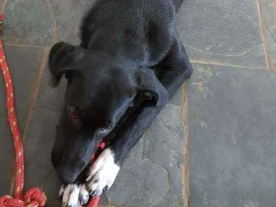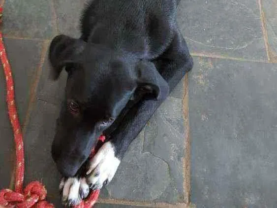 Porte grande. Ele é dengoso e brincalhão. Convive com gatos também.