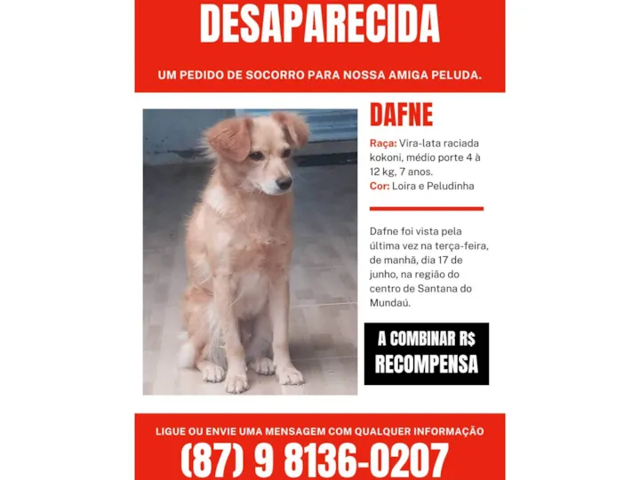 Vira-lata raciadakokoni, médio porte 8 à12 kg, 7 anos.Dafne foi vista pelaúltima vez na terça-feira,de manhã, dia 17 dejunho, na região docentro de Santana doMundaú.Ofereço recompensa! Estou angustiada para encontrá-la, nunca foi de não voltar para casa.