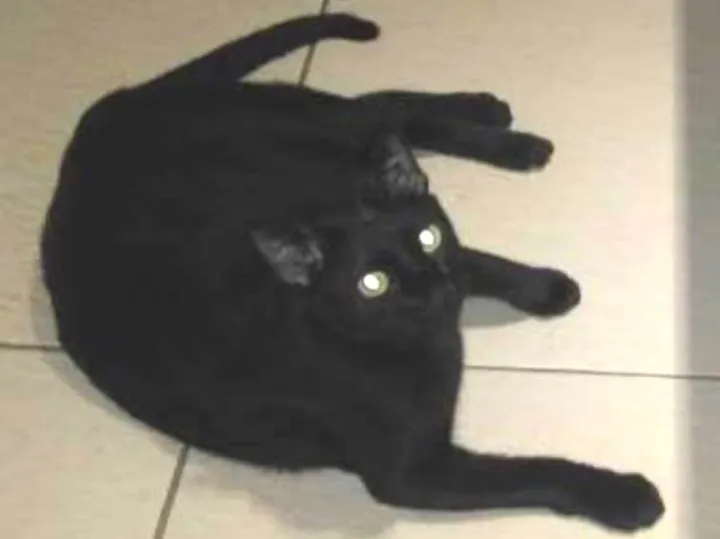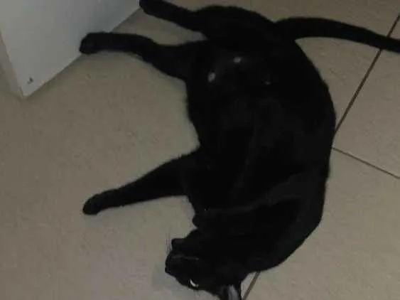Gato preto, cabeça pequena, característica principal: tem a barriga mole e pendurada quando anda. Achei na rua quase morto e depois de cuidar bastante sumiu de onde moro