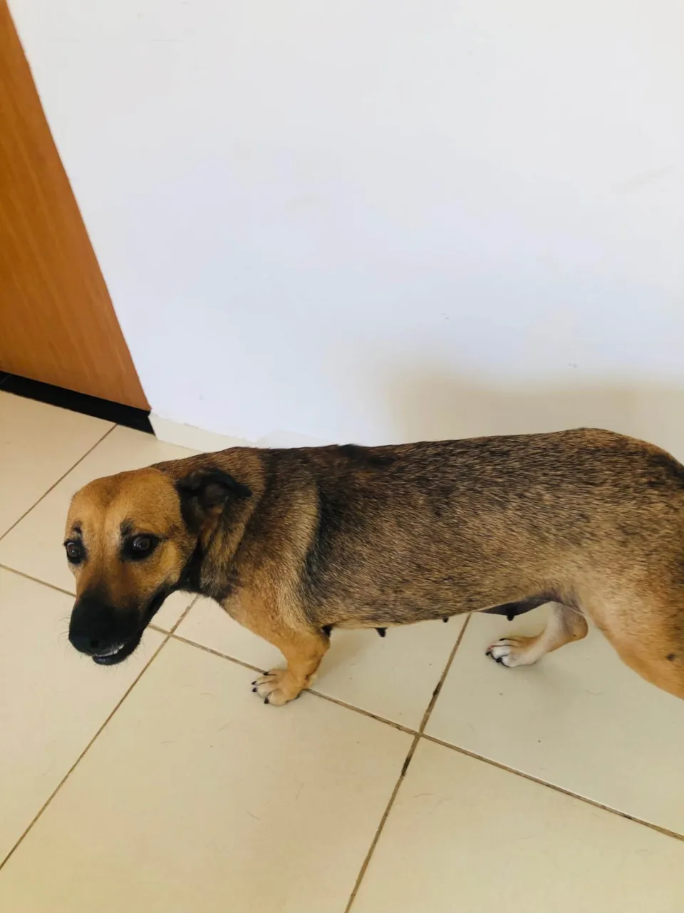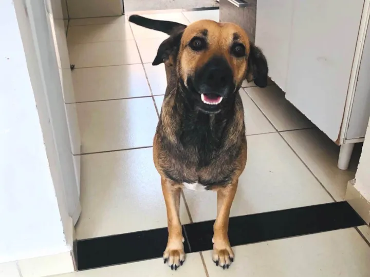 Parece um pouco com pastor alemão, rabo cumprido, focinho cumprido e orelha grande, super dócil
