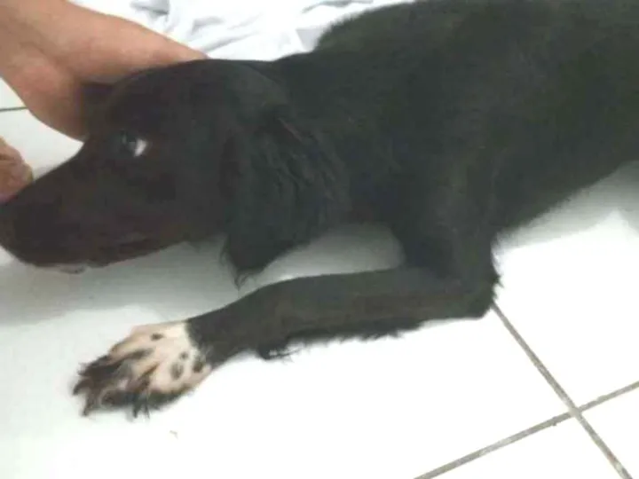 Cadela de pelagem preta brilhante, marcas brancas no fucinho e nas patas. Vacinação em dia, precisa de alguns cuidados....