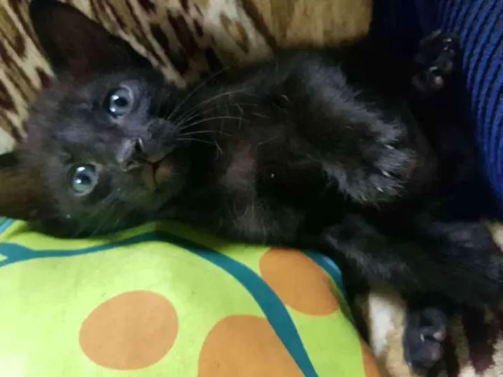Ele é pretinho, os olhos são uma cor indefinida ainda mas tudo indica que talvez seja verde. Ele têm 1 mês e 10 dias, já come razão e faz as necessidades na areia ou no jornal.