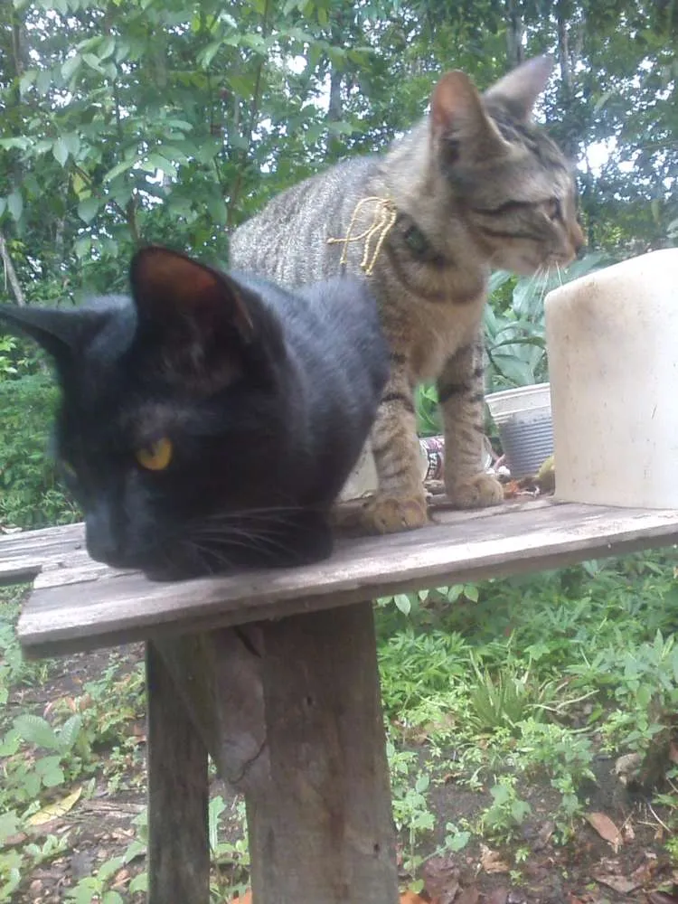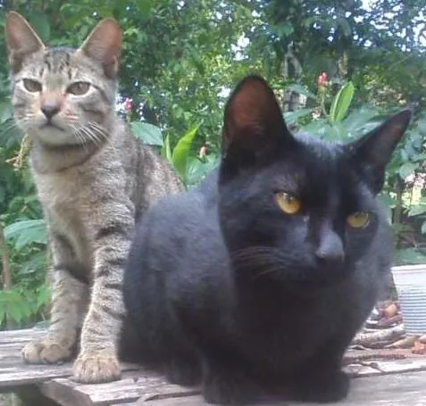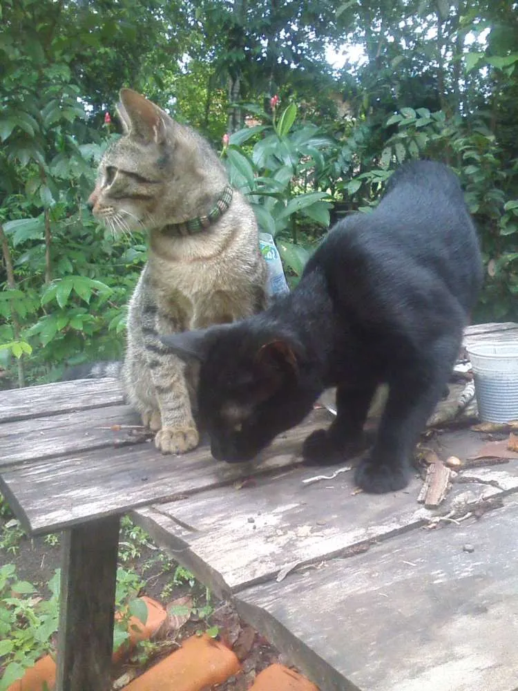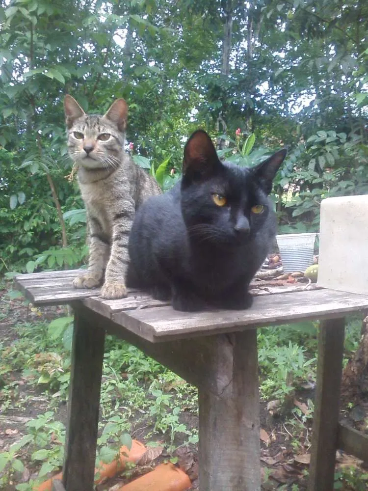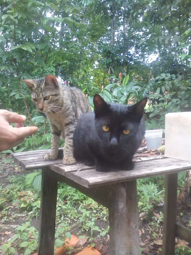 Temos esses dois lindos machos disponíveis para adoção. Eles tem por volta de 5 meses, são filhos de nossa gatoca. Estamos viajando por aí, fazendo malabares, artesanato e outras artes e infelizmente não podemos caminhar com três gatos (e nossa gata teve mais 5), estamos vivendo em uma residencia da qual temos certa pressa em sair, mas por conta dessa enorme demanda de gatos, 8 ao final, não estamos conseguindo sair nem da casa e muito menos do estado, então se alguém estiver querendo uma companhia dócil, amável, carinhosa e amiga esses são os companheiros! Ronronadores, carinhosos, brincalhões, comedores de fruta e escaladores de árvore. São muito, muito amor, mesmo! Queríamos poder ficar com eles, mas é muito delicado nos meios de transporte para levar animal, são muitos problemas.