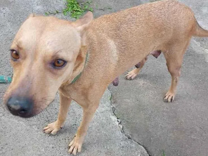 Tenho 12 cães. Minha filha tinha essa cadela e a irmã. Entretanto, mudou para um apartamento que não pode ter animal. Trouxe para minha casa. Os meus animais não se adaptaram a uma das irmãs. Houve uma briga e a irmã da Filó morreu.