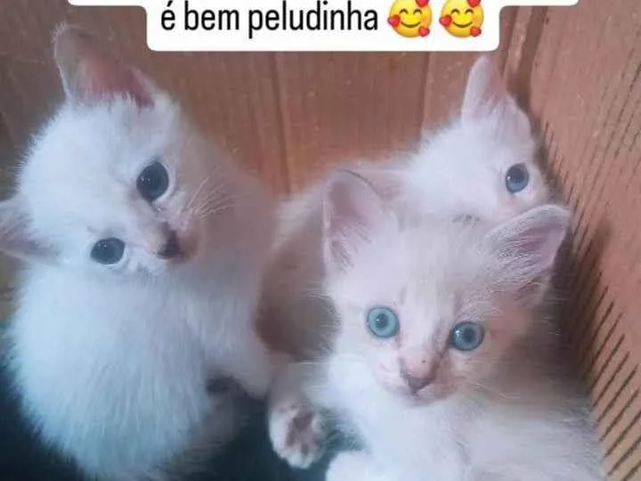 Conheçam os adoráveis gatinhos da raça SRD-ViraLata! Esses pequenos felinos são pura fofura, com suas pelagens brancas e olhos azuis encantadores. Com menos de dois meses de idade, são o retrato da inocência e curiosidade. Seu porte pequeno os torna perfeitos para qualquer ambiente.