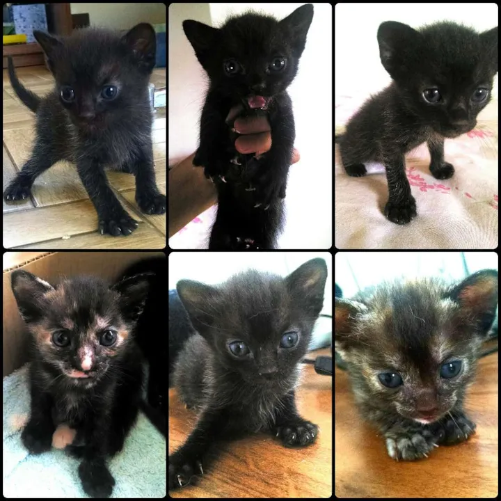 6 filhotes de gatos sem raça, sendo 3 machos todos pretos e 3 fêmeas preto, laranja e branco.