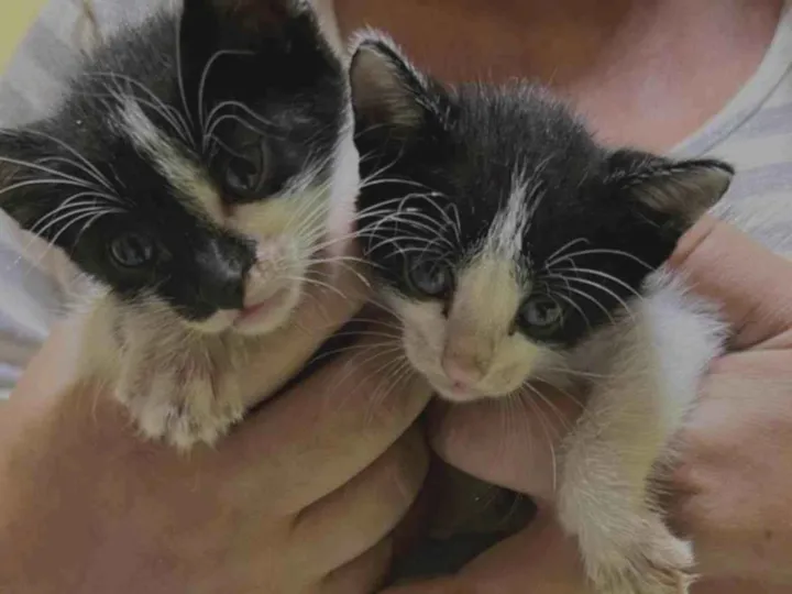 Dois gatinhos filhotes de pelo preto e branco, muito fofos, comem ração e usam caixa de areia, super dóceis, precisando de um lar pois foram abandonados