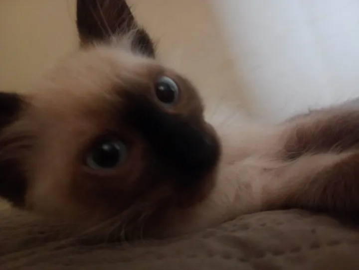 Encontrado junto ao irmão, ambos amarrados um ao outro por uma fita adesiva, dentro de uma caixa.O resgate foi feito e agora ambos se encontram disponíveis para adoção.O gato da foto de chama Zazul, tem 4 meses, é SRD, porém tem porte de siamês com olhos azuis.