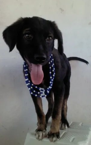 Cachorro mestiço, de 4 a 6 meses e aprox. 30 cm, com pelagem negra e castanha; manchas brancas abaixo do pescoço, ponta das patas e pontinha do rabo. De excelente humor e de vibrante energia. Muito simpático!!!