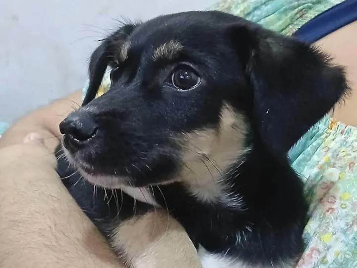 Filhote resgatado, procuramos alguém que posso cuidar dele. Infelizmente não achamos ninguém próximo que o acolhesse. Já temos duas cadelas e moramos em um local pequeno, por isso não podemos ficar com ele.