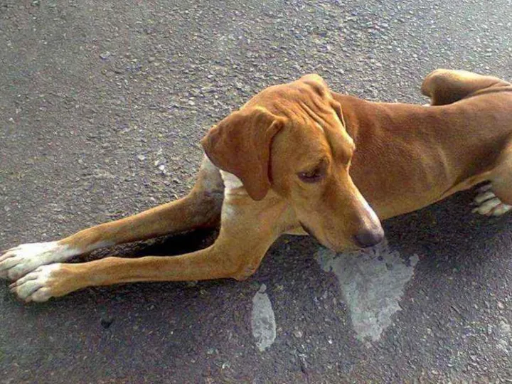 Cão grande, magro, manso,e medroso.