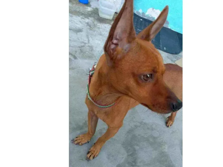 Cachorro dócil, tem o rabo comprido, sinais na arte de trás da língua, estava sem coleira quando fugiu.