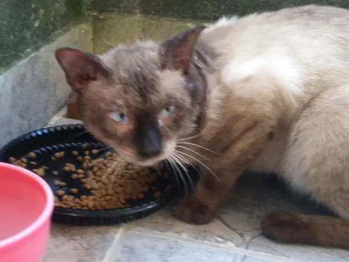 Mora nas ruas. Depende da Boa vontade de moradores p comer e beber. É dócil, amigável. Esta c a pele ferida porque vai tentar cruzar c as gatas. Precisa de um dono q cuide da pele e dê também outros cuidados necessários. Olhos azuis lindos!!