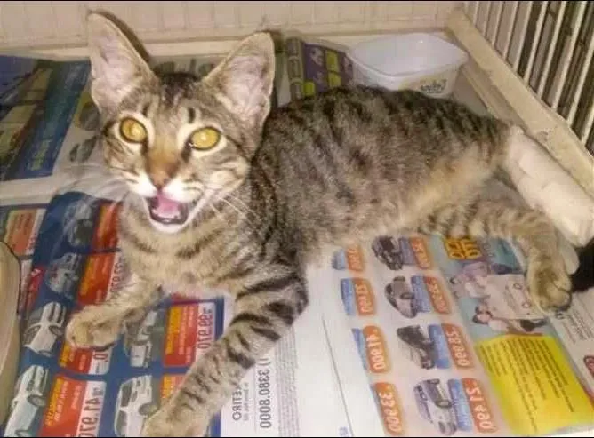 Dia 29/07/14, por volta das 22hrs, quando já estava entrando em casa, no Matatu de Brotas, uma criança orientado por duas mulheres, largou esse gatinho macho, de aproximadamente 5 meses da foto,perto da minha porta. Quando me aproximei vi que estava com um curativo em uma de suas patinhas traseiras, e logo senti um forte odor. Com a ajuda de minha irmã e meu pai abrimos o curativo e fizemos outro. O que encontramos foi uma pata fraturada, e afratura exposta. No dia seguinte, foi confirmado o que já imaginávamos, teria que amputar a patinha pois estava necrosada. Enfim, já estou providenciando a cirurgia pra amputar, a castração e as vacinas.