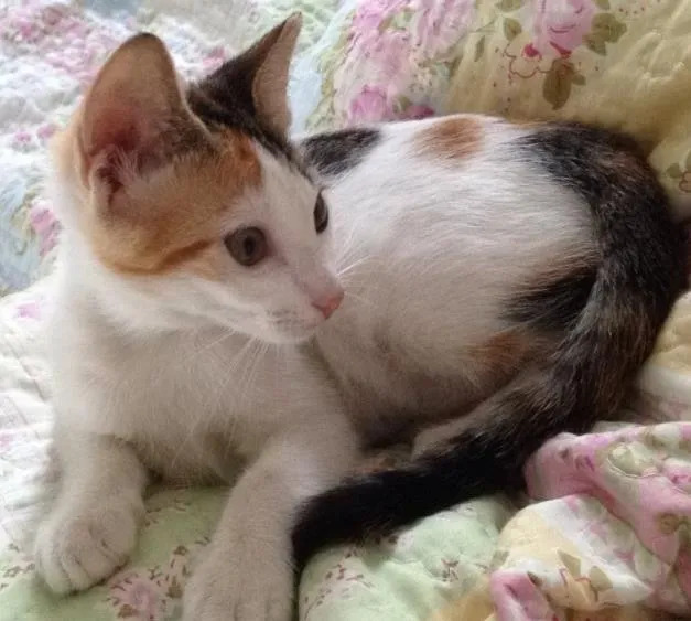 Olá! Sou uma gatinha muito meiga e dengosa. Estou castrada e saudável. Fui resgatada na rua, e por isso sou muito grata, passo o dia alegrando a casa da tia. Mas ela não pode ficar comigo. Sou pequena e juro não bagunçar muito. Me dá uma chance? Me adota!