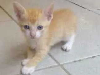 Filhote fofo de gato, com aproximadamente dois meses, tem pelagem amarelada e olhos azuis. É um animal calmo, brincalhão e carinhoso. já foi introduzido a alimentação em patê.