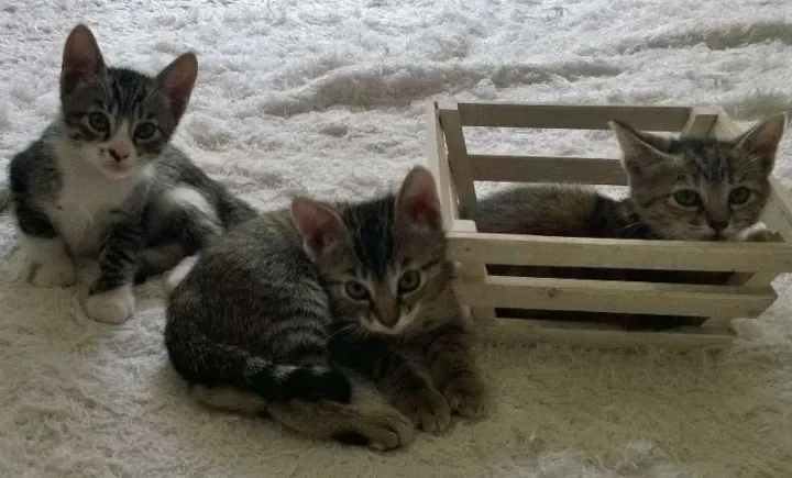 São três gatinhos sendo; 1 macho cinza com patinhas brancas e 2 fêmeas cinzas com malhadinhas amarelas bem suaves.
