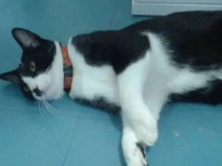 Gato encontrado em Stella Maris próximo ao Empório Greco e Posto Shell. Aparenta ser bem jovem, com pelagem branca e preta, olhos amarelos e coleira vermelha com desenhos e um sininho.