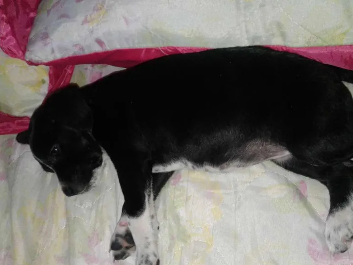 Ela é uma bebê, gosta muito de brincar , toda pretinha as 4 patas brancas, tem uma pontinha Branca pequena nas Costa,a barriga Branca com manchas pretas.