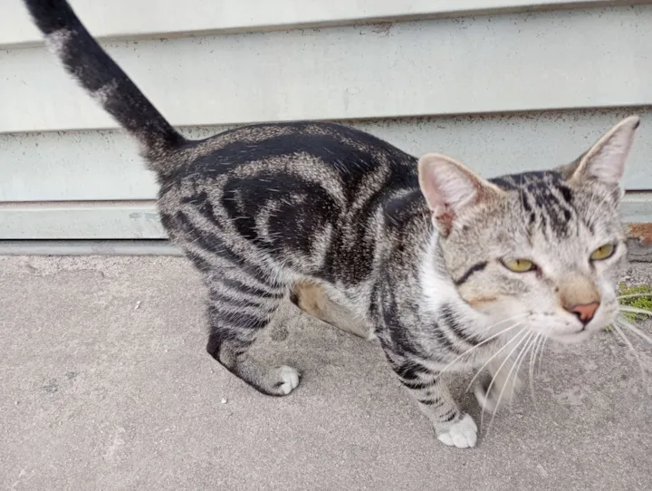Encontrei esse gatinho e temos alimento ele aqui no bairro, parece estar perdido. Não temos como pegar, porque moramos de favor e aqui não aceitam mais gatos.