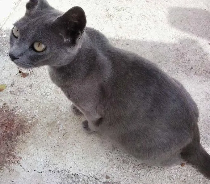 Tem o pelo cinza, olhos esverdeados, muito calma e carinhosa.