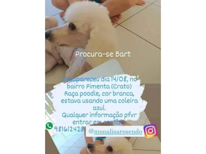 Ele está tosado e estava com uma coleira azul. Desapareceu no bairro Pimenta em crato