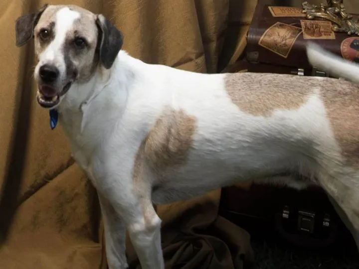 Pelagem curta, predominante branca com manchas marrons/bege. Orelhas escuras. Olhos escuros.