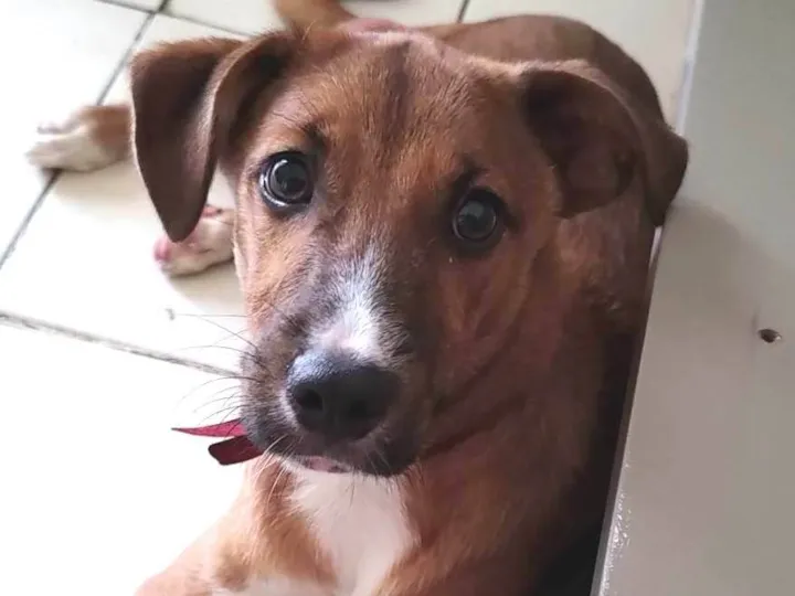 Esse cachorro apareceu ontem na porta da minha casa em um dia de chuva chorando, tem uma fita vermelha no pescoço, moro no centro na rua Castro e Silva com princesa Isabel