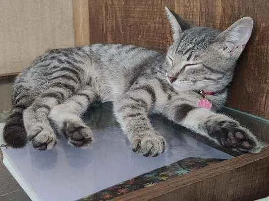 Essa menina de 3 meses chegou aqui na minha casa a alguns dias parece que foi abandonada estava faminta e com muito medo, mas agora está melhor foi tratada e vermifugada, ela é uma gatinha linda, curiosa e charmosa. Ela está saudável e precisa de tutor carinhoso. Infelizmente já tenho 4 gatos e não tenho condições adotar mais um.