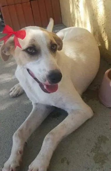 Tenho 7 meses,sou muito brincalhona e dócil,minha pelagem é linda:toda branquinha com manchinhas bege.