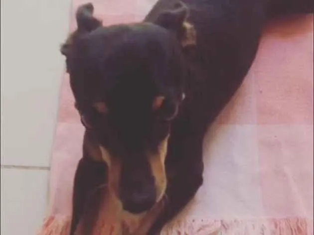 Cão da raça pinscher, preto, chamado Pitoco, calda longa, perdido na Lagoa Seca, Juazeiro do Norte Ceará. Estamos angustiados procurando.