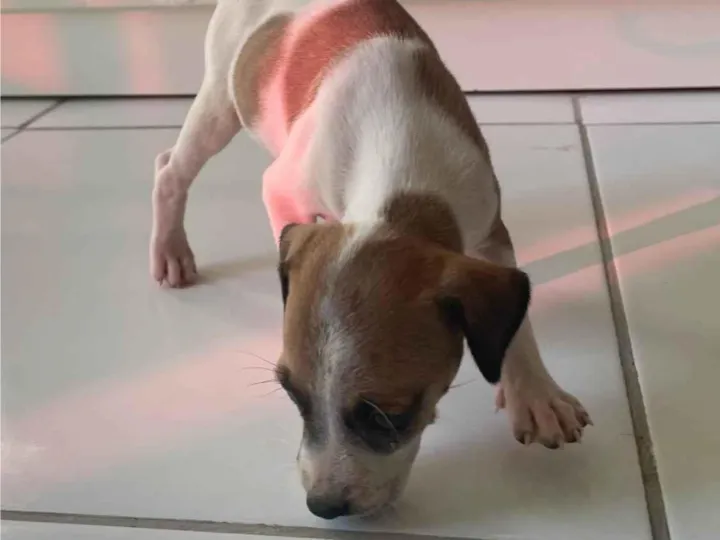 Filhote vira-lata branca com manchinhas marrons. Muito carinhosa e calminha. Foi abandonada com mais 5 filhotes