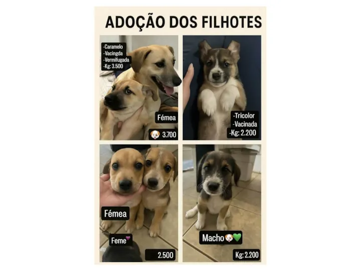 PRECISO DE AJUDA PARA DOAR ESSES FILHOTES. SAIO DE CASA EU E MINHA FILHA AS 06:00 E SÓ VOLTAMOS 22 HS.UM VIZINHO AJUDA, MAS ESTA FICANDO INSUSTENTÁVEL, JA RECEBI RECLAMAÇÕES DOS VIZINHOS POR CONTA DO CHEIRO E LATIDOS OS FILHOTES ESTAO CONFINADO NA GARAGEM E FALTA ESPAÇO JA ESTOU TENDO MUITAS RECLAMAÇÕES ESTOU VENDO A HORA DE RECEBER UMA DENÚNCIA Posso CONTRIBUIR COM RAÇÃO 3 MESES50 DIAS VACINADOS