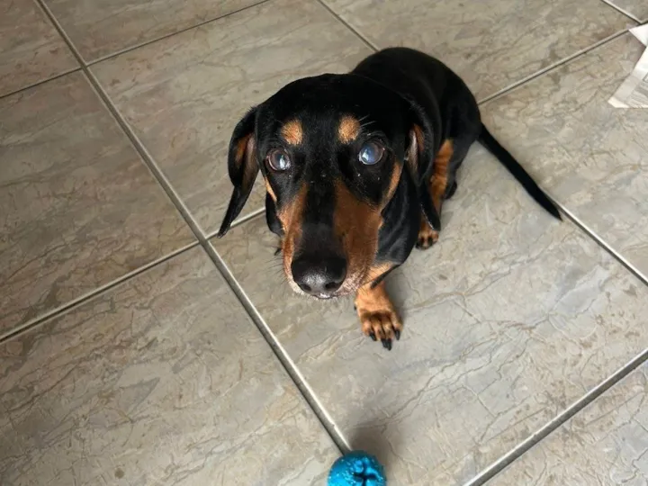 Salsichinha. Precisamos doar pois o prédio não aceita mais animais e passamos muito tempo fora. Acabou ficando muito estressado por isso é agressivo. Quando tem uma rotina de passeio e alimentação ele e um amor.
