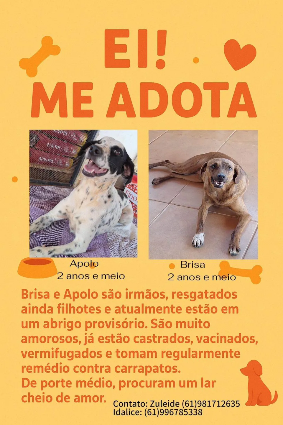 Vocês se lembram da história dos irmãos Zeus, Apollo e Brisa? Então, eles foram abandonados ainda filhotes e estavam com anemia e erliquiose (doença do carrapato). Foram resgatados, tratados e, depois de curados, postos para adoção responsável.