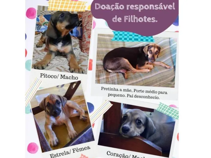Resgatamos um cadelinha já grávida da rua, ela teve seis filhotes. Atualmente com 50 dias temos Duas Fêmias caramelo, um macho caramelo, um macho preto com manchas douradas e um macho cinza com manchas brancas
