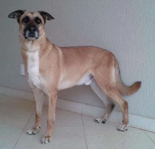 Cão de guarda, mestiço de pastor alemão com cadela SRD, oito anos de idade, boa saúde, manso com os donos e anti-social com estranhos, vacinação e vermifugação em dia. Não convive bem com outros cães.
